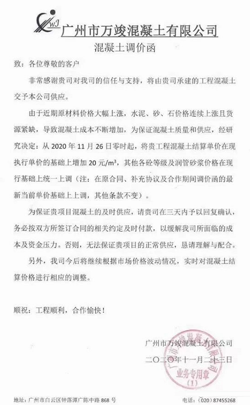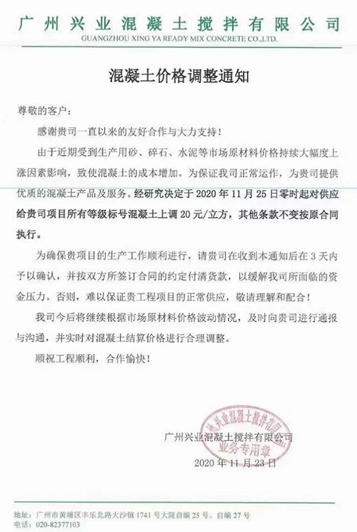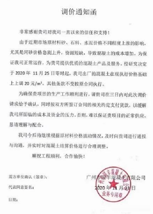 由于近期受到生產用砂、碎石、水泥等市場原材料價格持續大幅度上漲因素影響,致使混凝土的成本增加。為保證我司正常運作,為貴司提供優質的混凝王產品及服務。經研究決定于2020年11月25日零時起對供應給貴司項目所有等級標號混凝土上調20元/立方,其他條款不變按原合同執行。