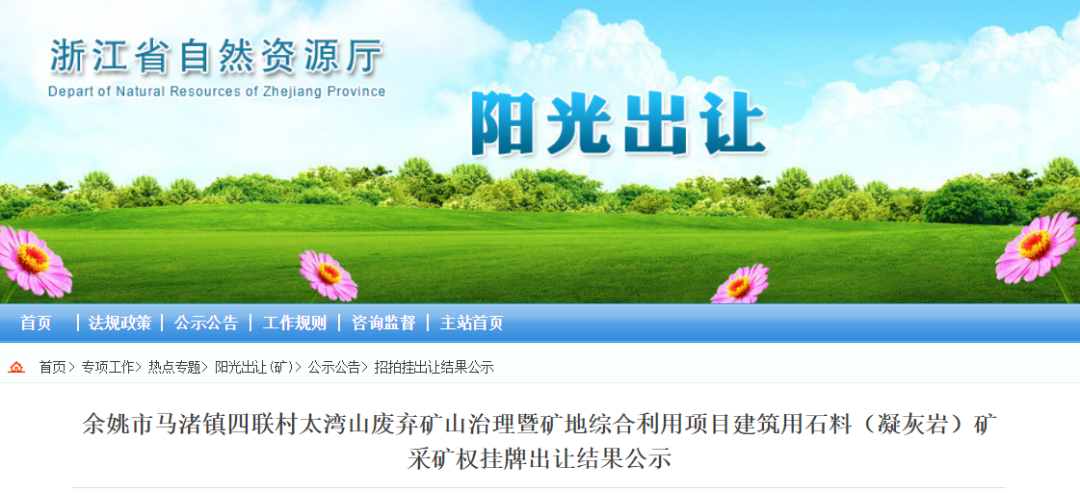 根據(jù)《轉(zhuǎn)發(fā)國(guó)土資源部關(guān)于印發(fā)〈礦業(yè)權(quán)交易規(guī)則〉的通知》(浙土資規(guī)〔2017〕9號(hào))的規(guī)定,現(xiàn)將“余姚市馬渚鎮(zhèn)四聯(lián)村太灣山廢棄礦山治理暨礦地綜合利用項(xiàng)目建筑用石料(凝灰?guī)r)礦”采礦權(quán)網(wǎng)上掛牌出讓結(jié)果有關(guān)事項(xiàng)公示如下: