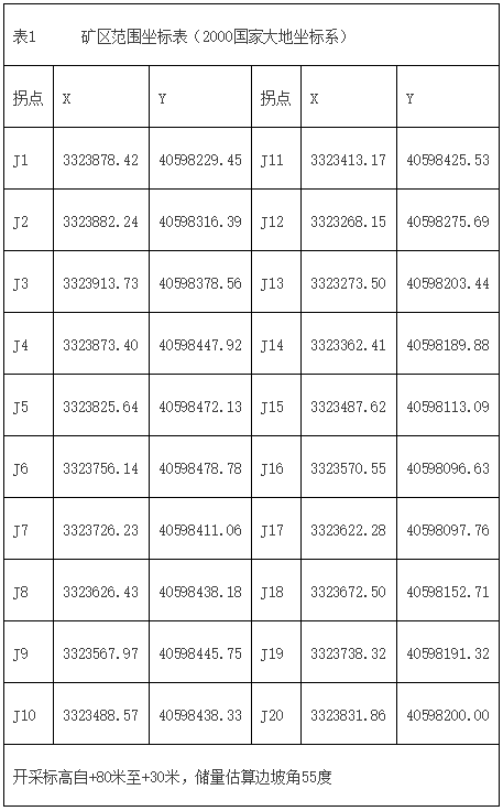 4、礦區(qū)范圍:由20個(gè)拐點(diǎn)圈定,礦區(qū)面積約0.1624平方千米,開(kāi)采標(biāo)高自+80.0米至+30.0米,礦區(qū)范圍坐標(biāo)見(jiàn)表1。