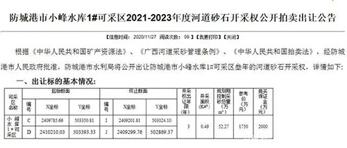 近日,廣西防城港市水利局在防城港市公共資源交易中心發布了三則拍賣出讓公告,擬公開拍賣小峰水庫的河道三宗