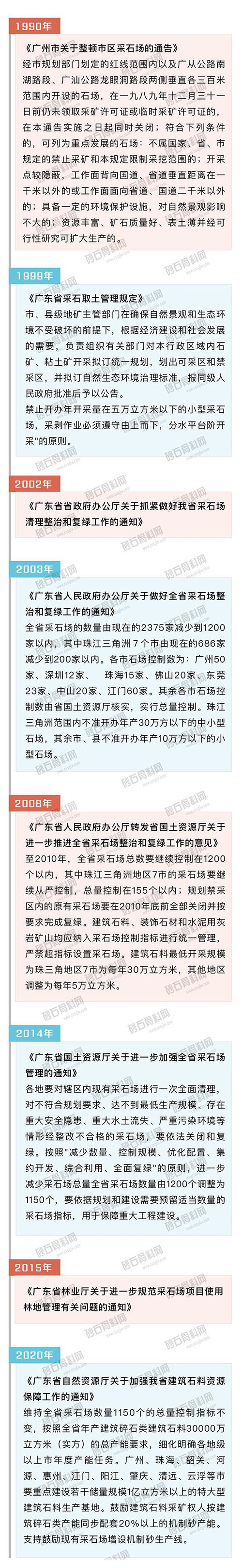 面對野蠻生長的砂石行業,廣州市人民政府于1990年發布《關于整頓市區采石場的通告》,對未領取許可證、重點地區內以及沿線采石場采取限時關停措施,并列明成為重點發展石場的相應條件,培育規范化生產企業。