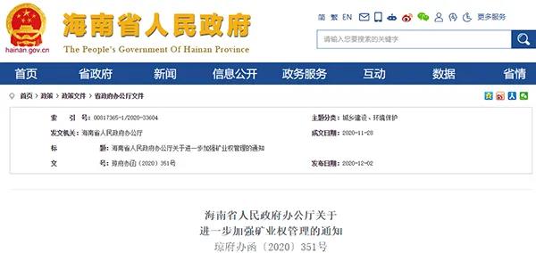 12月2日,為深入貫徹生態文明思想,牢固樹立和踐行“綠水青山就是金山銀山”理念,進一步依法依規加強礦業權管理,減少礦業活動對生態環境的影響,確保海南生態環境只能更好、不能變差,海南省人民政府辦公廳發布了《關于進一步加強礦業權管理的通知》。