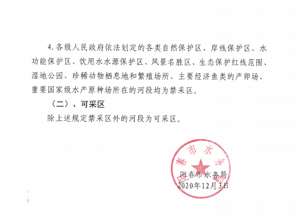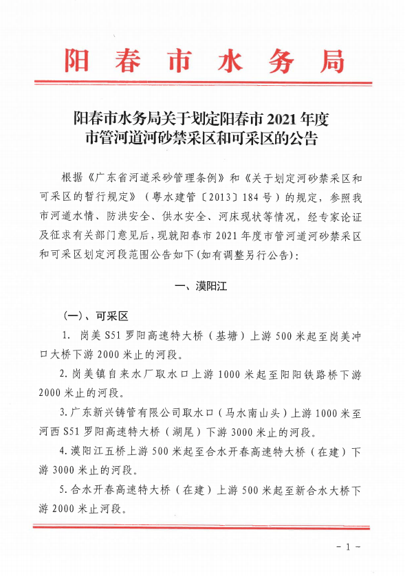 采砂管理條例 》 和 《 關于劃定河砂禁采區和可采區的暫行規定 》 (粵水建管 【2013】184 號)的規定,參照我市河道水情,防洪安全、供水安全、河床現狀等情況,經專家論證及征求有關部門愈見后.現就陽春市 2021年度市河道河砂禁采區和可采區劃定河段范圈公告如下(如有調整另行公告):