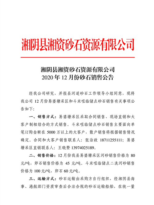 據(jù)悉,湘陰縣湘資砂石資源有限公司發(fā)布2020年12月份易婆塘采區(qū)和斗米咀臨儲(chǔ)點(diǎn)砂石銷售有關(guān)事項(xiàng)公告如下: