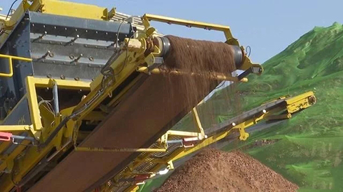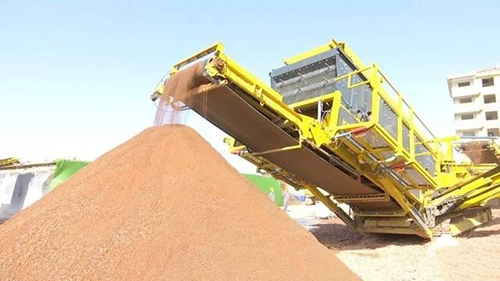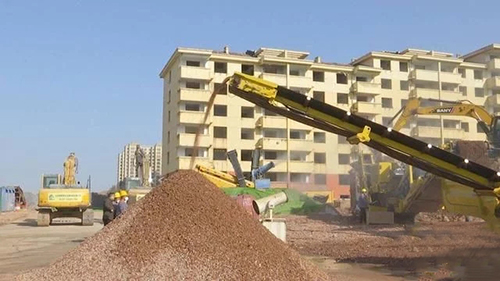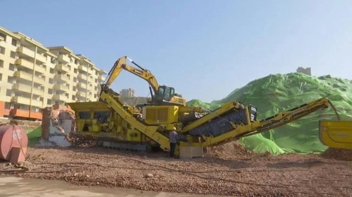 記者在現(xiàn)場(chǎng)看到,兩臺(tái)大型機(jī)器組成了一條生產(chǎn)線,一臺(tái)挖掘機(jī)正在向第一臺(tái)機(jī)器內(nèi)投放大塊建筑垃圾進(jìn)行破碎處理,破碎后的建筑垃圾順著傳送帶進(jìn)入第二臺(tái)機(jī)器。