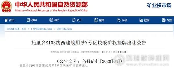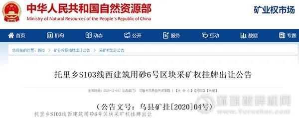 近期,烏魯木齊縣自然資源局發布采礦權掛牌出讓公告,將以掛牌交易的方式公開出讓托里鄉S103線西建筑用砂6號區塊與7號區塊兩宗采礦權,具體事宜如下:
