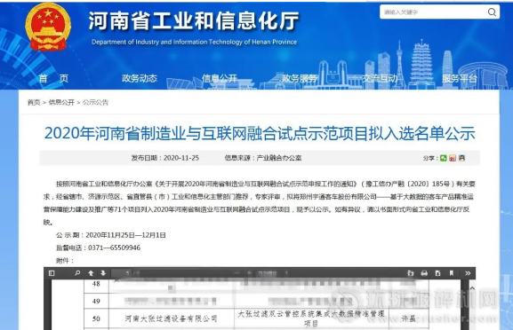 河南省工業和信息化廳公示了2020年河南省制造業與互聯網融合試點示范項目名單
