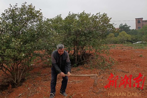 12月23日上午,湖南衡陽衡東縣霞流鎮鑫霞村7組油茶種植戶鄧云華,右手提著鋤頭,來到自家的油茶地,揮著鋤頭給茶樹覆土培兜。記者看到,這片油茶林面積大約3畝多,大的油茶樹高1米左右,小的大約五六寸。茶樹的枝頭綻放出潔白的油茶花,茶花的清香沁人心脾。