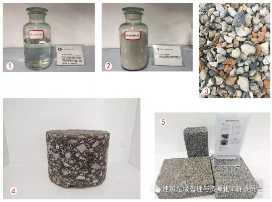 建筑垃圾再生產(chǎn)品:①廠拌熱再生瀝青再生劑;②水穩(wěn)增強(qiáng)劑;③再生骨料;④再生瀝青;⑤在生砌塊