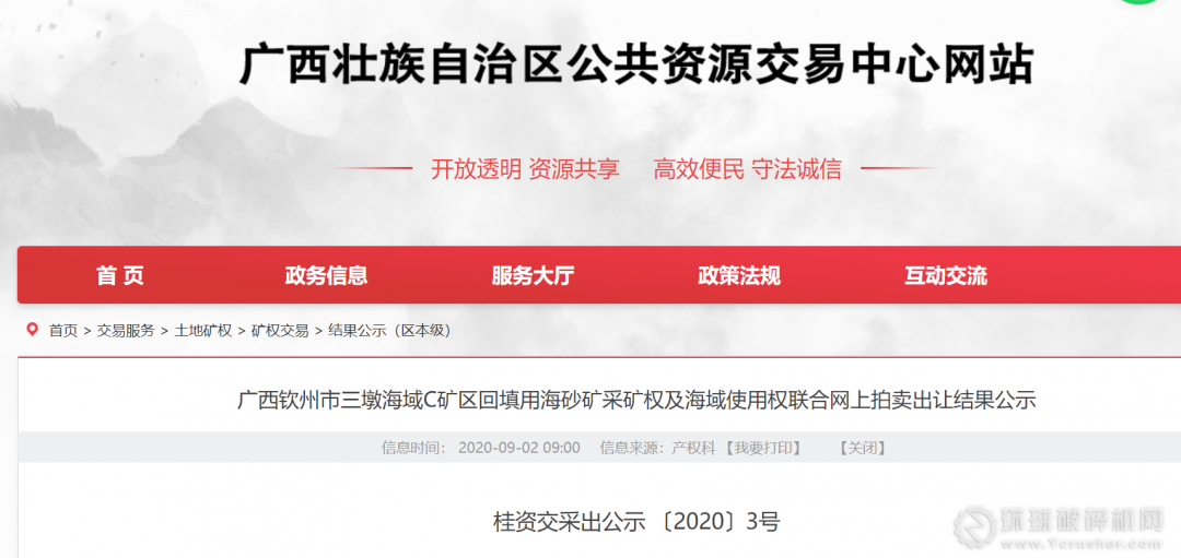 2020年8月24日,經過356輪激烈競價,廣西欽州市三墩海域C礦區回填用海砂礦采礦權及海域使用權最終被廣西自貿區北港臨海資源有限公司以115,440萬元競得。此次出讓起拍價為人民幣24840萬元(其中,采礦權出讓起拍價為8930萬元,海域使用權出讓起拍價為15910萬元),海域使用權競買保證金人民幣7955萬元。