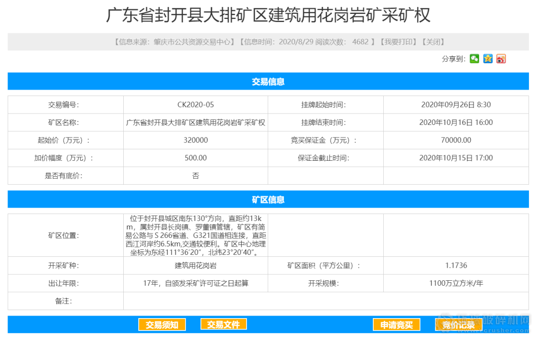 2020年10月16日,華潤集團旗下肇慶潤信新材料有限公司以32.1億元競得廣東省封開縣大排礦區建筑用花崗巖礦采礦權,出讓年限為17年,礦區面積約1.1736平方公里,資源儲量約1.57億立方米,規劃年產能約1100萬立方米。