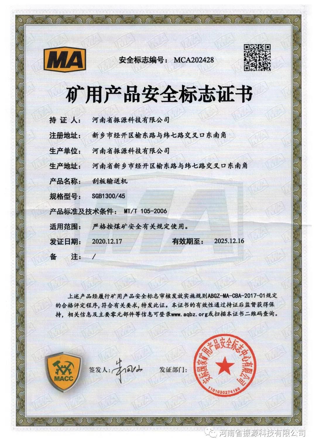 輸送機順利通過“安標國家礦用產品安全標志中心”驗收,取得煤安證書!
