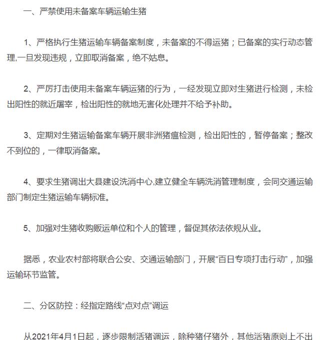日前,農業農村部發布《非洲豬瘟防控強化措施指引》,表示從2021年4月1日起,逐步限制活豬調運。除種豬仔豬外,其他活豬原則上不出大區,并明確嚴禁使用未備案車輛運輸生豬。