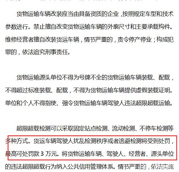 主要內容包括:維修經營者不得擅自改裝貨運車輛;貨物運輸源頭不能協助或強令駕駛人超載超限運輸;貨運車輛駕駛人逃避治超檢驗或者擾亂治超檢測秩序的,最高將面臨30000元罰款!