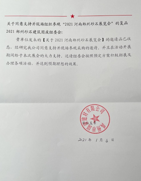 2021鄭州砂石展進展丨河南國泰建材同意支持并現場組織參觀采購的復函!