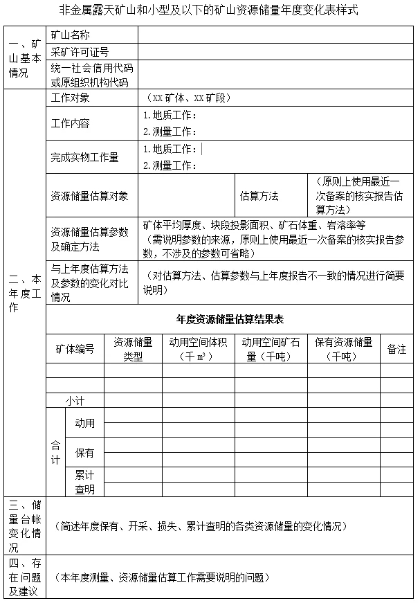 非金屬露天礦山和生產(chǎn)規(guī)模為小型及以下的礦山,不需編制礦山儲量年度報(bào)告,但應(yīng)填寫《非金屬露天礦山和小型及以下的礦山資源儲量年度變化表》,編制采掘(剝)平面圖、井下井上工程對照圖和資源儲量估算圖。