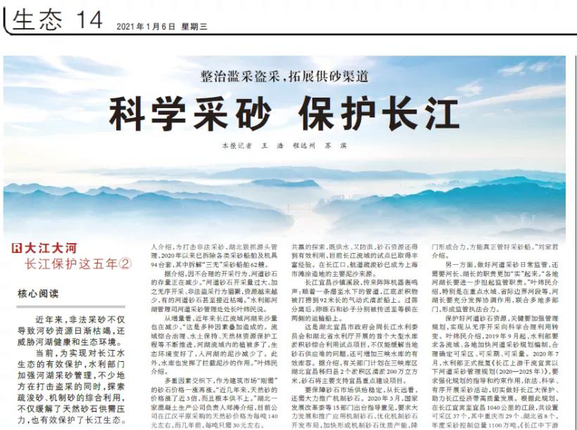 當前,為實現對長江水生態的有效保護,水利部門加強河湖采砂管理,圍繞長江等大江大河,出臺流域重要河段的河道采砂管理規劃;各地在打擊盜采的同時,多渠道拓展砂源,探索疏浚砂、機制砂的綜合利用,確保采砂科學有序開展,不僅緩解了天然