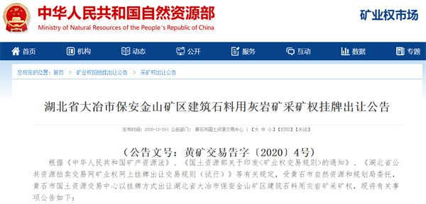 近日,黃石市自然資源和規劃局發布了《湖北省大冶市保安金山礦區建筑石料用灰巖礦采礦權掛牌出讓公告》,將委托黃石市國土資源交易中心以掛牌方式出讓湖北省大冶市保安金山礦區建筑石料用灰巖礦采礦權,有關事項如下: