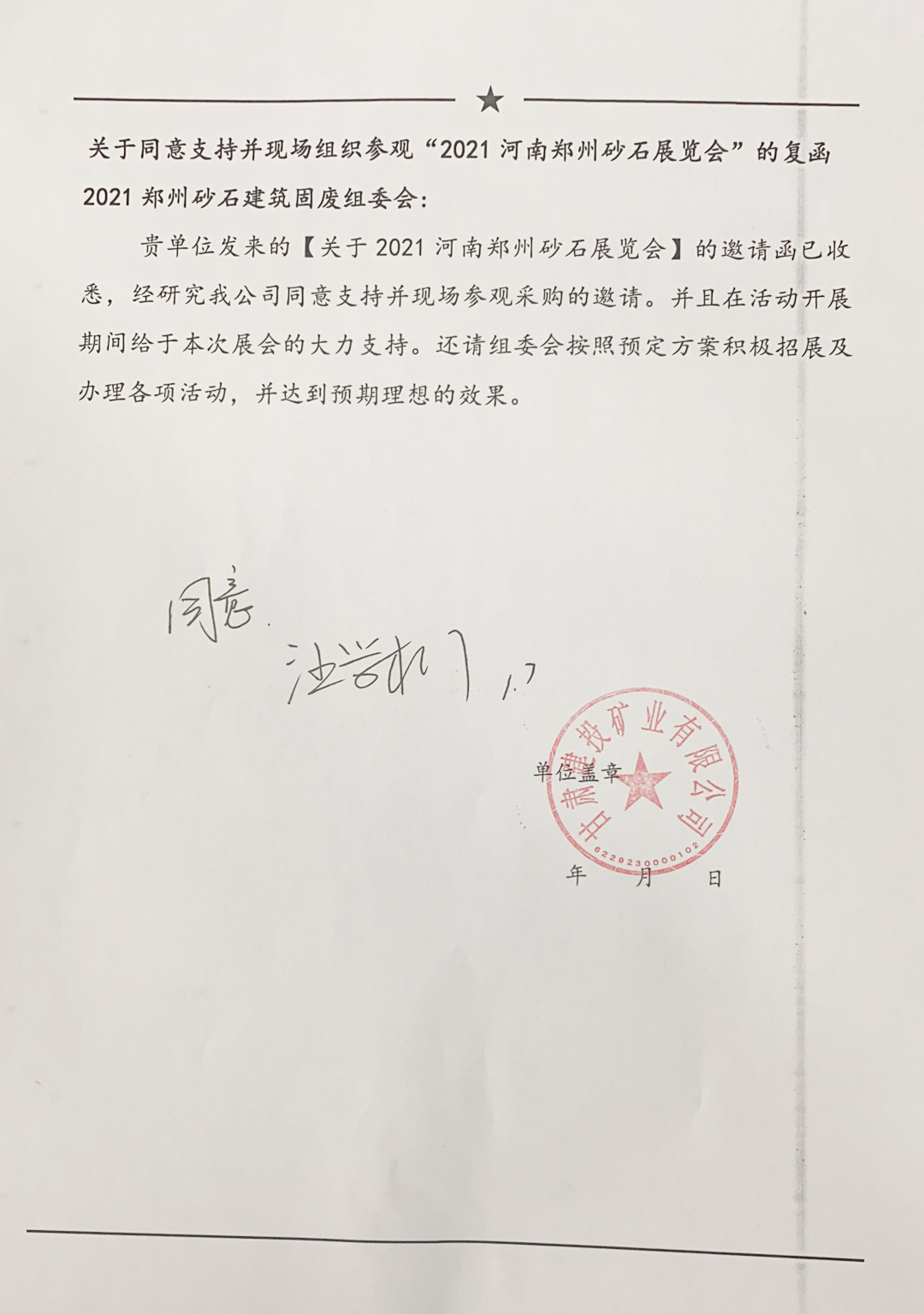 2021鄭州砂石展 | 甘肅建投礦業有限公司同意支持并現場組織參觀采購的復函!