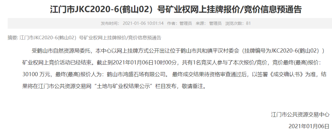 1月6日,鶴山市鴻盛石場有限公司以底價30100 萬元成功競得廣東省鶴山市共和鎮平漢礦區建筑用花崗巖礦采礦權。