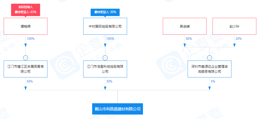鶴山市利昌盛建材有限公司成立于2020年12月22日,位于鶴山市共和鎮里元村村民委員會辦公樓三樓,注冊資本500萬人民幣,法人許榮強。背后投資人分別為江門市蓬江區豐展貿易有限公司,占股65%;江門市浩盈科技控股有限公司,占股30%;深圳市嘉源達企業管理咨詢服務有限公司,占股5%。江門市浩盈科技控股有限公司為中材國際控股有限公司全資子公司。
