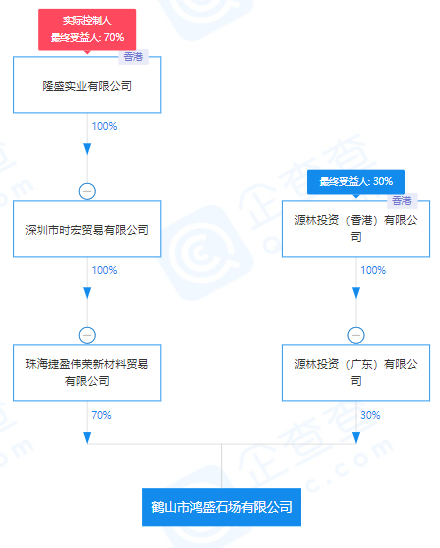鶴山市鴻盛石場有限公司成立于2017年8月1日,位于鶴山市共和鎮平漢村委會山頂村原平漢石坑石場舊址,注冊資本3000萬人民幣,法人劉偉雄。背后投資人分別為港資企業隆盛實業有限公司,占股70%;港資企業源林投資(香港)有限公司,占股30%。