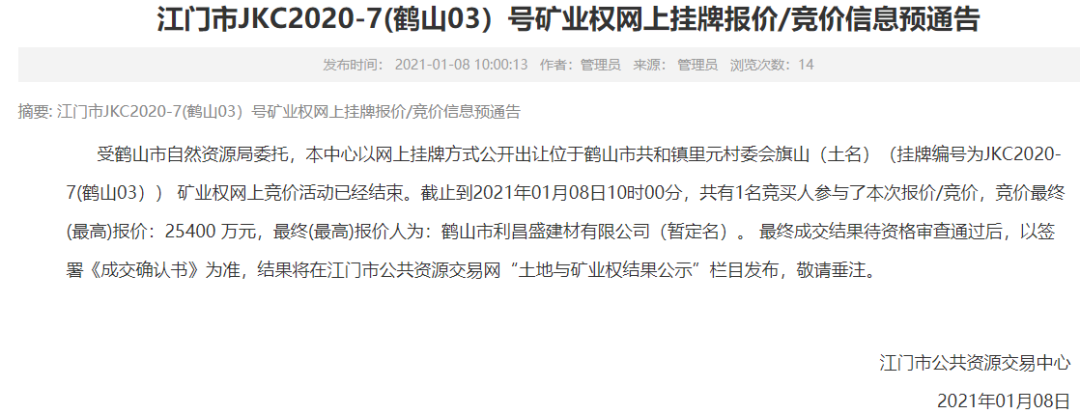 1月8日,鶴山市利昌盛建材有限公司以底價25400 萬元拍得廣東省鶴山市共和鎮旗山礦區建筑用花崗巖礦采礦權。