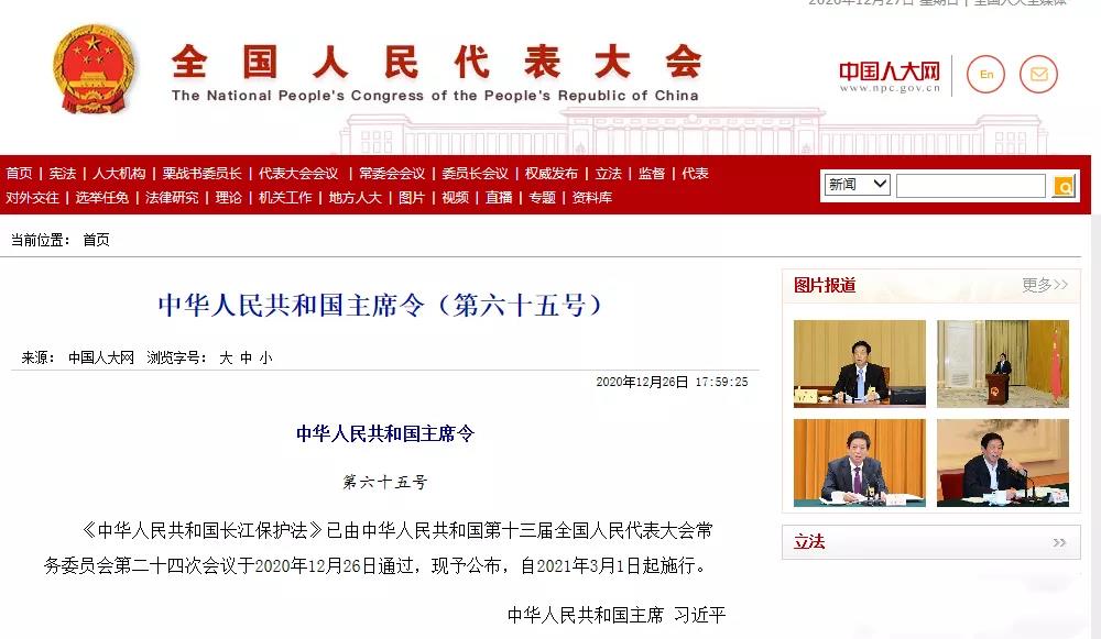 據中國砂石協會了解,國家主席習近平于2020年12月26日簽發第六十四號、六十五號、六十六號、六十七號、六十八號中華人民共和國主席令。第六十五號主席令說,《中華人民共和國長江保護法》已由中華人民共和國第十三屆全國人民代表大會常務委員會第二十四次會議于2020年12月26日通過,現予公布,自2021年3月1日起施行。