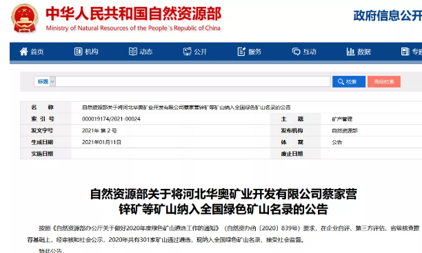 1月11日,自然資源部發布通知稱,按照《自然資源部辦公廳關于做好2020年度綠色礦山遴選工作的通知》要求,在企業自評、第三方評估、省級核查推薦基礎上,經審核和社會公示,2020年共有301家礦山通過遴選,現納入全國綠色礦山名錄。