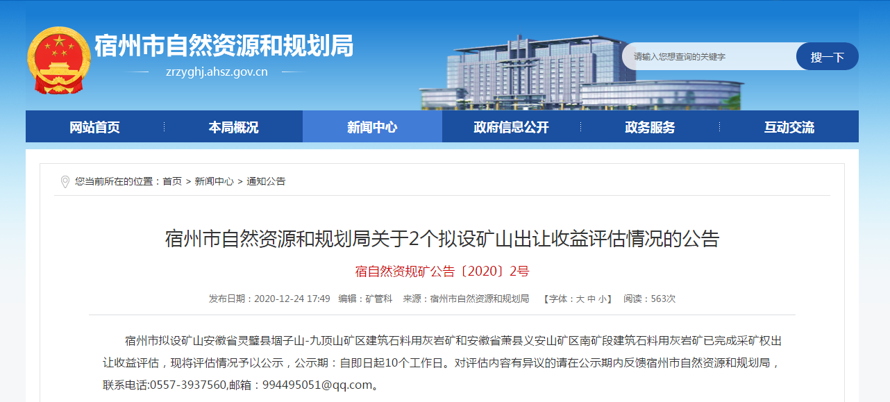 近日,蕭縣自然資源和規劃局擬對安徽省蕭縣義安山礦區南礦段建筑石料用灰巖礦采礦權進行公開出讓,故按照國家有關規定,先行委托專業機構對該采礦權出讓收益進行評估,并將結果進行網上公示。
