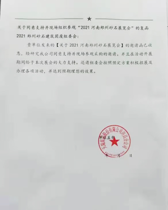 尾礦與建筑固廢處理技術展覽會特邀現場參觀采購的復函。天瑞集團股份有限公司許昌分公司在復函中表示同意支持并現場參觀采購的邀請,并且在活動開展期間給予本次展會大力支持。在此,組委會感謝天瑞集團股份有限公司許昌分公司對展會的支持,也歡迎更多的企業報名參觀!