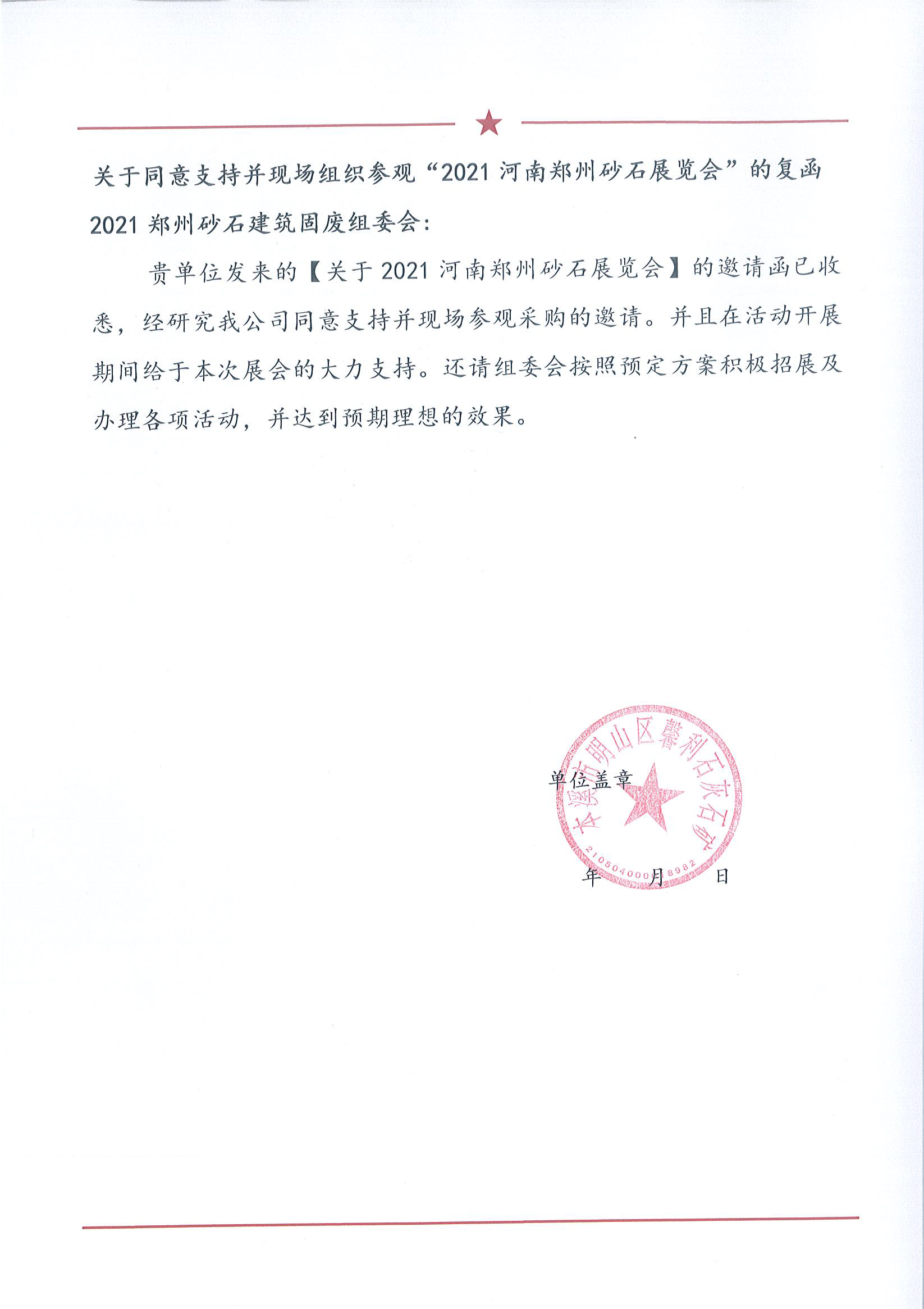 近日,組委會收到了本溪市明山區馨利石灰石礦關于2021中國(鄭州)國際砂石及尾礦與建筑固廢處理技術展覽會特邀現場參觀采購的復函,表示同意支持并現場參觀采購的邀請,并且在活動開展期間給予本次展會大力支持。在此,組委會感謝本溪市明山區馨利石灰石礦對展會的大力支持,也歡迎更多的企業報名參觀!
