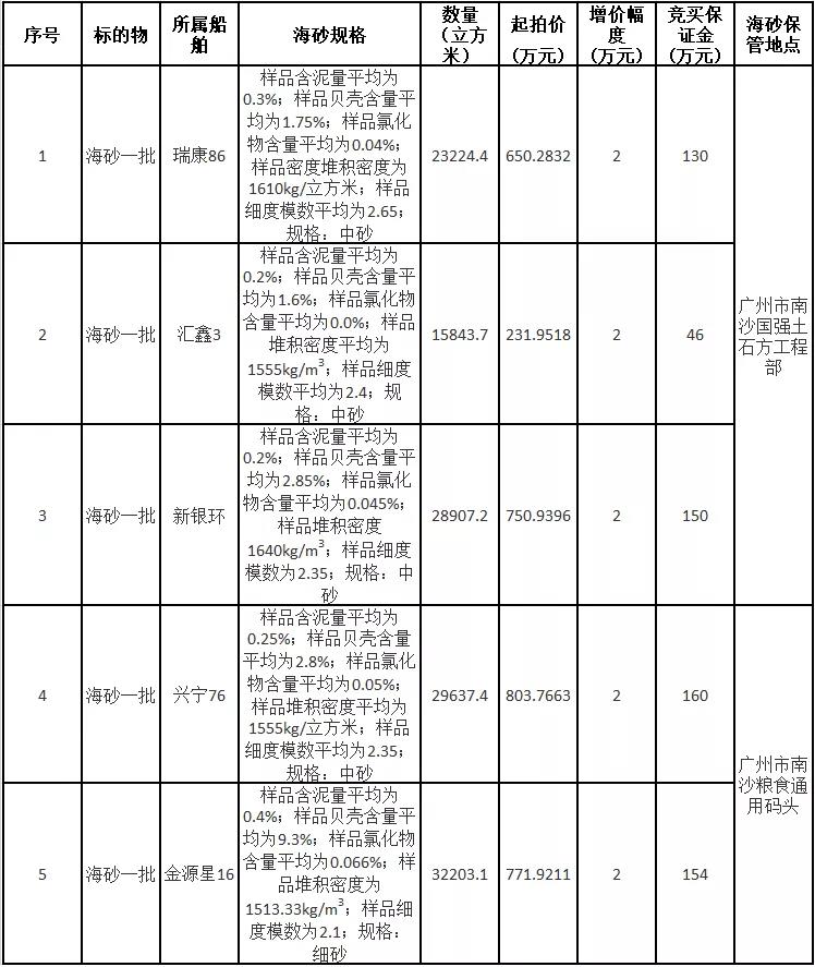 廣州海警局5宗涉案海砂網上拍賣公告