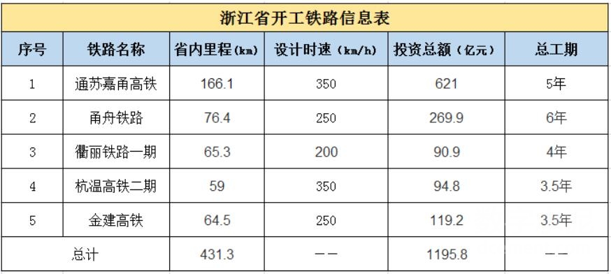 其中,高速鐵路項目包括通蘇嘉甬高鐵、甬舟鐵路、衢麗鐵路一期、杭溫高鐵二期、金建高鐵等5個鐵路項目,本次開工項目總里程431.3千米,總投資突破千億元,達1195.8億元,其中通蘇嘉甬高鐵,總投資達621億元,為投資金額最大、里程最長的項目。具體鐵路信息如下圖所示: