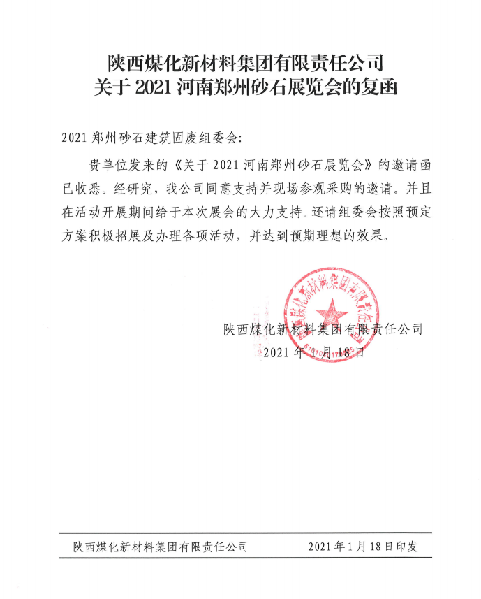 近日,陜西煤化新材料集團有限責任公司正式回函給2021鄭州砂石展組委會,明確表示支持2021中國(鄭州)國際砂石及尾礦與建筑固廢處理技術展覽會的舉辦,將與組委會攜手共同打造中西部砂石行業盛會。在此,組委會感謝陜西煤化新材料集團對展會的大力支持,也歡迎更多的企業報名參觀!