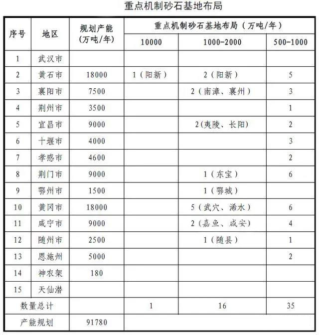規劃在黃石陽新規劃建設1個億噸級機制砂石生產基地;在黃岡武穴、咸寧嘉魚、黃石陽新、宜昌夷陵和長陽、荊門東寶等具備條件的地區規劃建設一批千萬噸級機制砂石生產基地。