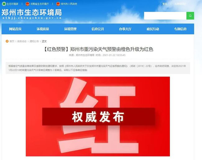 1月22日10時55分,記者從鄭州市環境攻堅辦了解到,鄭州市重污染天氣預警由橙色升級為紅色。