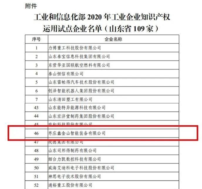 日前,工業和信息化部公布了2020年度工業企業知識產權運用試點企業名單,棗莊鑫金山智能裝備有限公司憑借優異的研發創新實力,健全的知識產權管理體系成功入選,標志著公司知識產權工作再上新臺階。