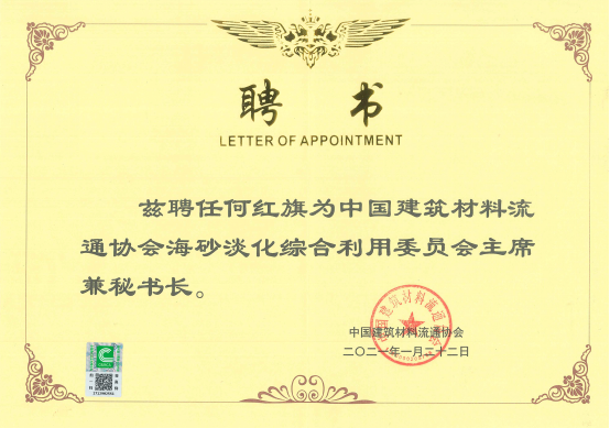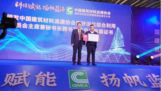 在本次成立大會(huì)上,中材建筑科技集團(tuán)董事長何紅旗獲聘為海砂淡化綜合利用委員會(huì)主席兼秘書長。中國建筑材料流通協(xié)會(huì)會(huì)長秦占學(xué)為其頒發(fā)聘書以及社會(huì)團(tuán)體分支機(jī)構(gòu)備案證書。而后,何紅旗主席兼秘書長分別為海砂淡化綜合利用委員會(huì)常務(wù)副主席林國忠、副主席劉政生、執(zhí)行秘書長黃冠日、常務(wù)副秘書長嚴(yán)望平、副秘書長劉超、副秘書長鄧盛國頒發(fā)聘書。