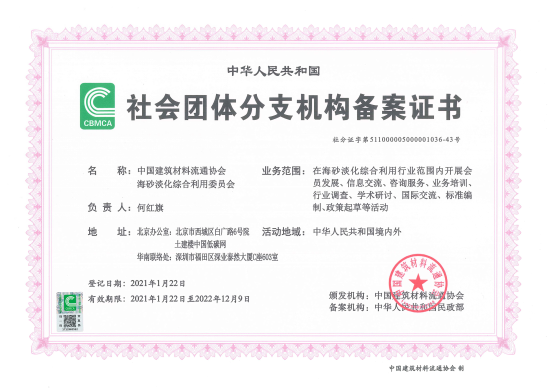在此背景下,中國建筑材料流通協(xié)會(huì)海砂淡化綜合利用委員會(huì)應(yīng)運(yùn)而生。中國建筑材料流通協(xié)會(huì)是經(jīng)國家民政部批準(zhǔn)成立的全國建筑材料流通業(yè)的行業(yè)性組織,由建材流通企業(yè)、建材生產(chǎn)企業(yè)、建材與家居商品市場(chǎng)、建材與家居經(jīng)銷商、建材物流與信息化服務(wù)企業(yè)以及科研和教育部門、相關(guān)社會(huì)團(tuán)體、相關(guān)專家學(xué)者等自愿結(jié)成的全國性、行業(yè)性社會(huì)團(tuán)體。中國建筑材料流通協(xié)會(huì)希望通過成立海砂淡化綜合利用委員會(huì),進(jìn)一步匯聚行業(yè)各方機(jī)構(gòu),連通產(chǎn)業(yè)鏈上下游,促進(jìn)和規(guī)范我國海砂淡化產(chǎn)業(yè)的發(fā)展,提高行業(yè)管理水平和服務(wù)水準(zhǔn),為國家相關(guān)政府部門建言獻(xiàn)策,為商協(xié)會(huì)、科研機(jī)構(gòu)和企業(yè)建立溝通渠道、加強(qiáng)交流與合作。