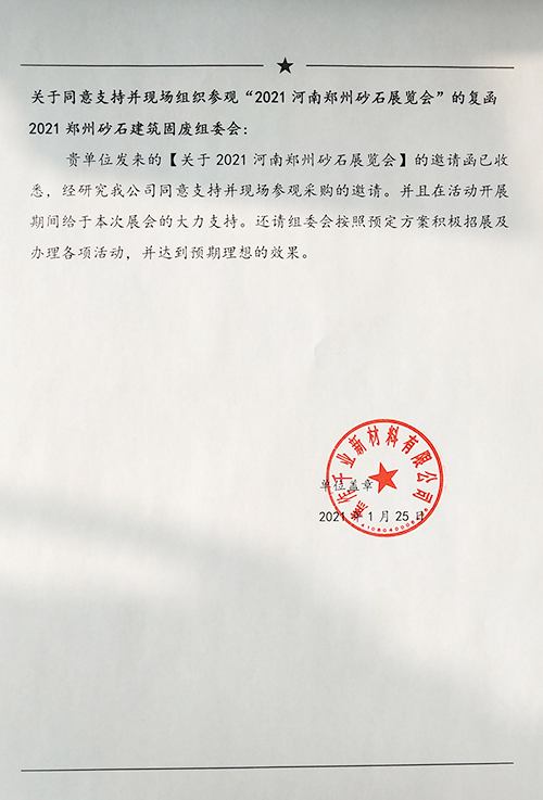 尾礦與建筑固廢處理技術展覽會特邀現場參觀采購的復函。焦作千業新材料有限公司在復函中表示同意支持并現場參觀采購的邀請,并且在活動開展期間給予本次展會大力支持。在此,組委會感謝焦作千業新材料有限公司對展會的支持,也歡迎更多的企業報名參觀!