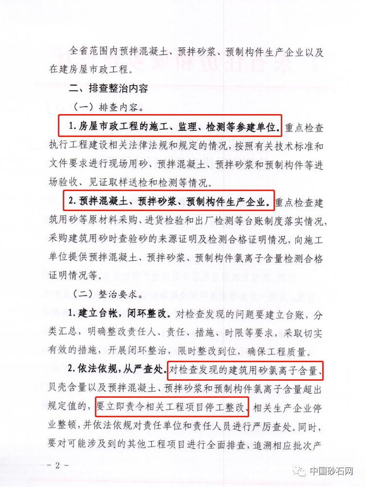 對檢查發現的建筑用砂氯離子含量、貝殼含量以及預拌混凝土、預拌砂漿和預制構件氯離子含量超出規定值的,要立即責令相關工程