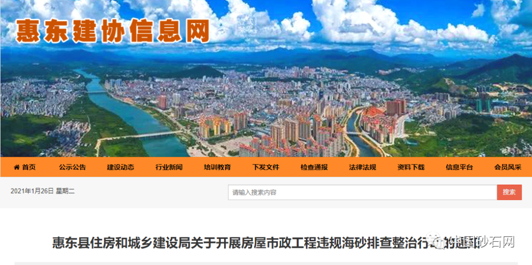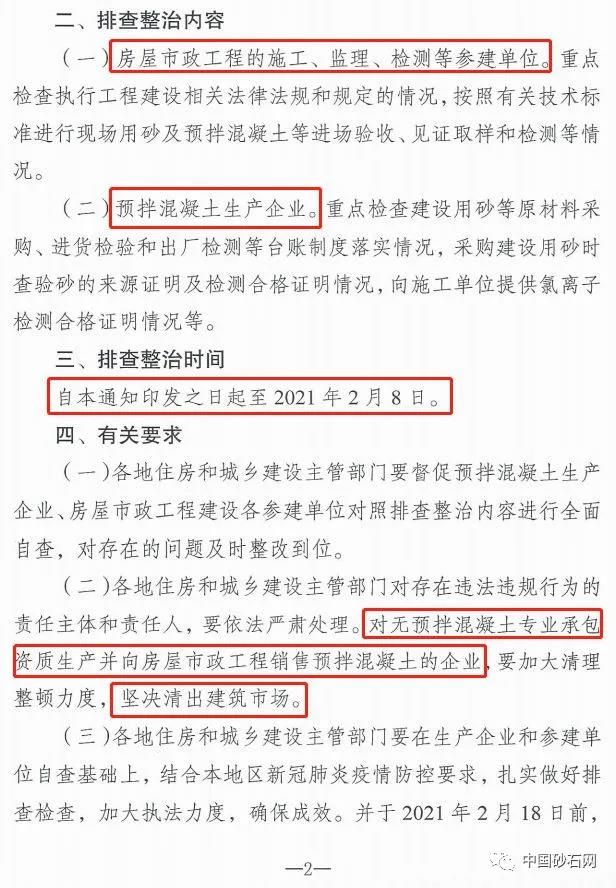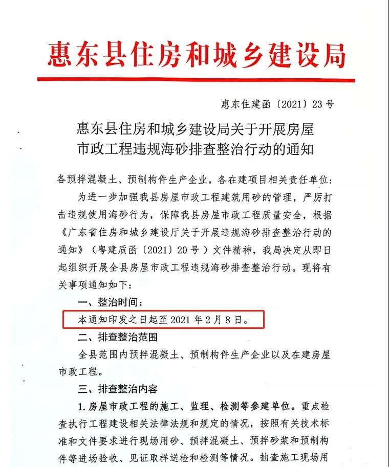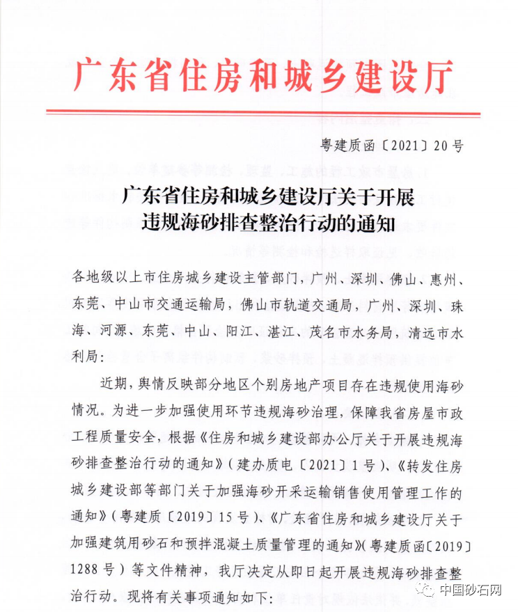 近期,住房和城鄉建設部辦公廳印發《關于開展違規海砂排查整治行動的通知》(建辦質電[2021]1號),開展違規海砂排查整治行動,進一步加強使用環節違規海砂治理,保障房屋市政工程質量安全。