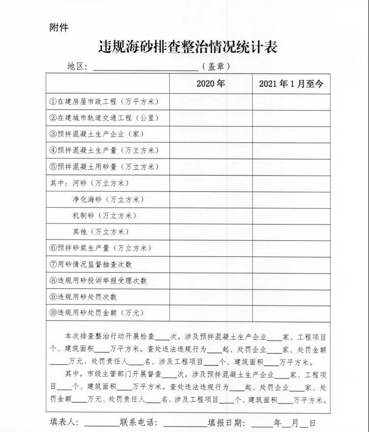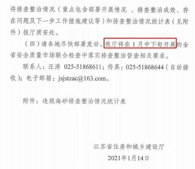 一、各園區(鎮街)住建局應認真開展整治行動,切實做好違規海砂排查工作,并于2021年1月29日前將治理行動情況及《違規海砂排查整治情況統計表》(詳見附件2)報送市建設工程質量監督站(蓋章掃描后可通過質量監督系統上傳回復)。