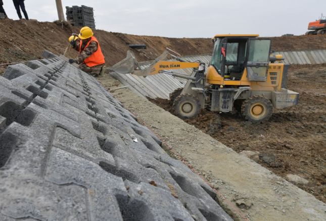 1月30日,在湖北省棗陽(yáng)市琚灣鎮(zhèn)蔡西村旱改水施工現(xiàn)場(chǎng),襄陽(yáng)漢江城建集團(tuán)有限公司施工人員正用建筑垃圾生產(chǎn)的新型連鎖式水工磚修建水渠。目前,這個(gè)工地共使用新型建材16050立方米。