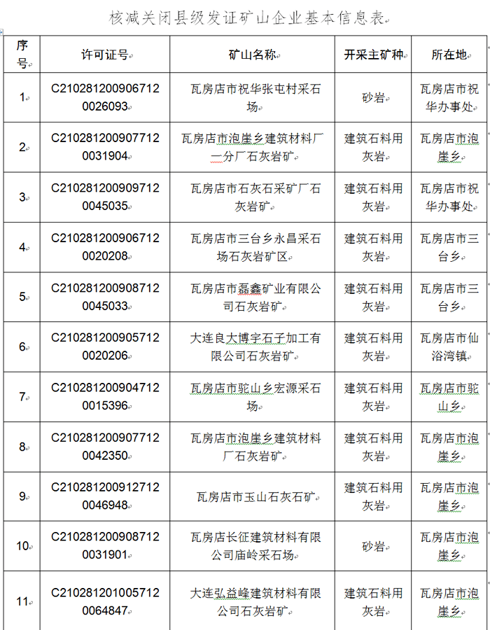 2月1日,瓦房店市人民政府發布《關于關閉礦山企業決定的公告》(簡稱《公告》),決定對瓦房店市祝華張屯村采石場等15家縣級頒發采礦許可證的礦山企業進行核減關閉。