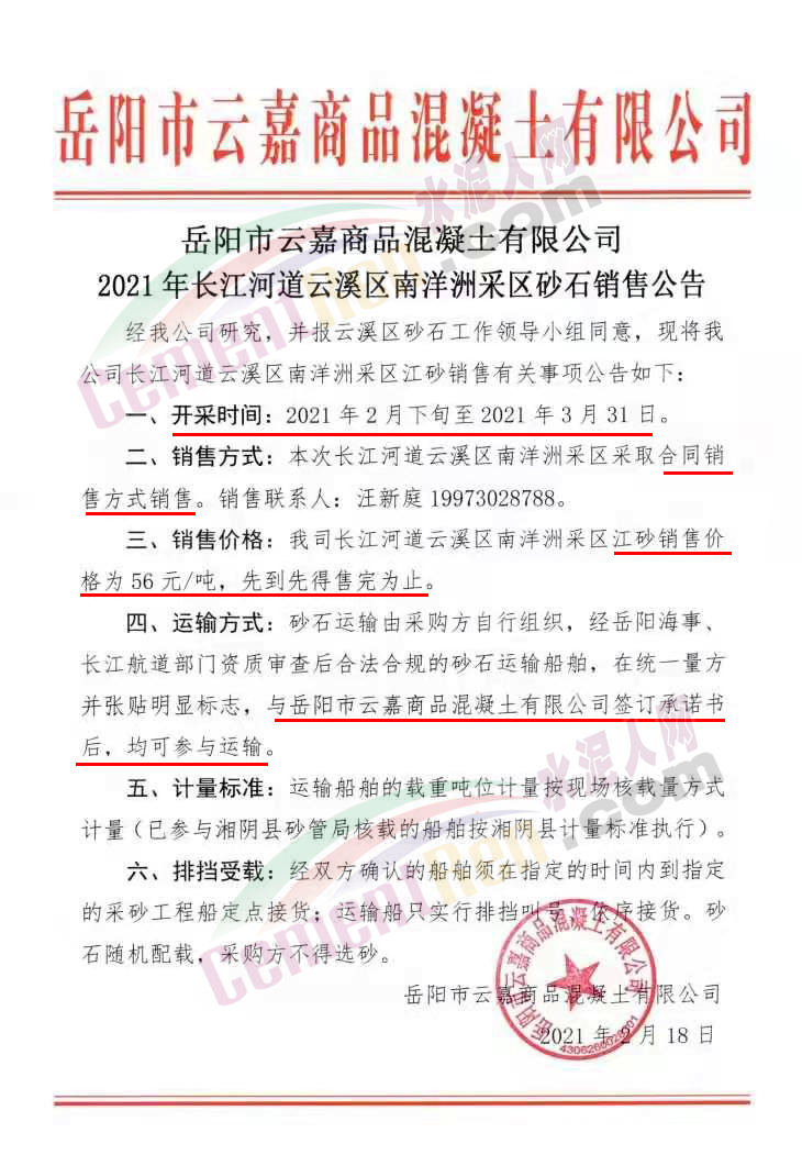 2月18日,湖南省岳陽市云嘉商品混凝土有限公司發布《2021年長江河道云溪區南洋洲采區砂石銷售公告》稱,自本月下旬至3月底銷售江砂,價格為 56 元/噸,且先到先得,售完為止。