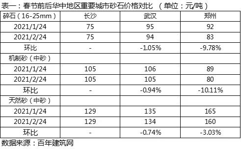 據數據顯示,截止2月24日,華中地區節后重要城市砂石價格較節前均出現不同程度的回落,鄭州地區碎石價格節前92元/噸,節后下跌9元/噸,環比跌幅達9.78%,機制砂價格最高跌幅達10.11%。