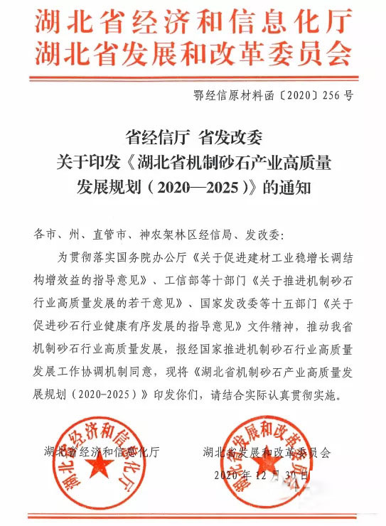 依托行業協會研究制定機制砂石應用于湖北省工業和民用建筑、交通工程、水利工程的產品質量標準、檢驗規程;建立健全全省建設用砂石溯源信息管理平臺,完善規范機制砂石生產 使用管理體系,加強機制砂石生產和應用過程質量管控。