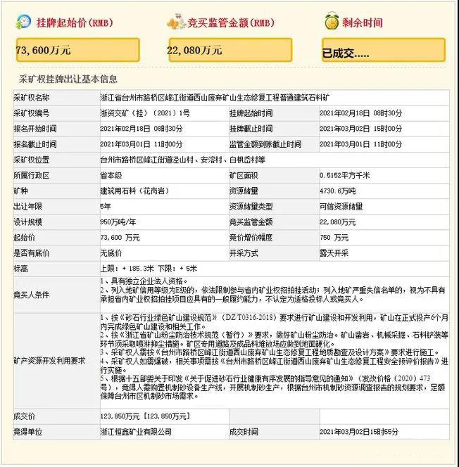 礦山生態修復工程普通建筑石料礦,經過67輪競價,浙江恒鑫礦業有限公司以12.385億元拍得此礦權。起拍價7.36億元,溢價率68.3%。礦區建筑用石料(花崗巖)礦可信資源儲量1867.35萬立方米(4730.60萬噸),平均拍得資源單價66.3元/立方米。